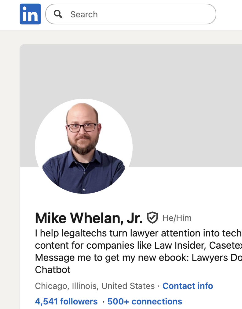 With posts targeting followers in both the legal and marketing space, Mike engages in daily conversations about selling to lawyers. Get actionable advice, applicable research, and stimulating conversation by connecting with Mike on LinkedIn.